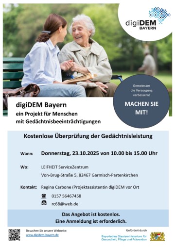 Im Nachgang zur 6. Bayerischen Demenzwoche 2025 finden am Donnerstag, 23. Oktober 2025 in Garmisch-Partenkirchen und am Freitag, 24. Oktober 2025 in Murnau Demenz-Screeningtage statt. Bürgerinnen und Bürger aus der Umgebung von Garmisch-Partenkirchen und Murnau können ihre Gedächtnisleistung kostenfrei und mit Hilfe eines wissenschaftlichen Kurztests überprüfen lassen. Dazu lädt digiDEM Bayern, das Digitale Demenzregister Bayern in Erlangen, gemeinsam mit seiner Projektassistentin vor Ort, Regina Carbone, und seinen Forschungspartnern, Beate Löw-Schneyder vom LEIFHEIT ServiceZentrum in Garmisch-Partenkirchen und dem Caritas Mehrgenerationenhaus (MGH) Murnau, herzlich ein. Das Testangebot richtet sich an Menschen ab 65 Jahren, die bei sich selbst eine Verschlechterung des Gedächtnisses wahrgenommen oder bei denen nahestehende Personen ein Nachlassen der geistigen Leistungsfähigkeit bemerkt haben.